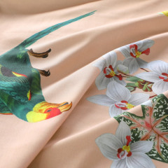 Creëer een betoverende en exotische sfeer in je slaapkamer. De zachtroze achtergrond is op de voorzijde bedrukt met bloemen, vlinders en papegaaien. De combinatie van kleuren en levendige motieven maken van dit overtrek een absolute eye-catcher.