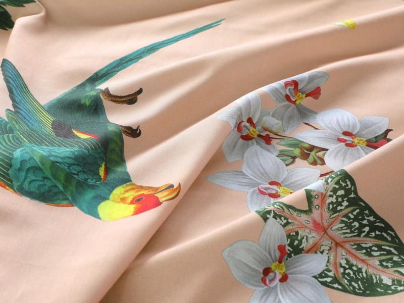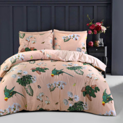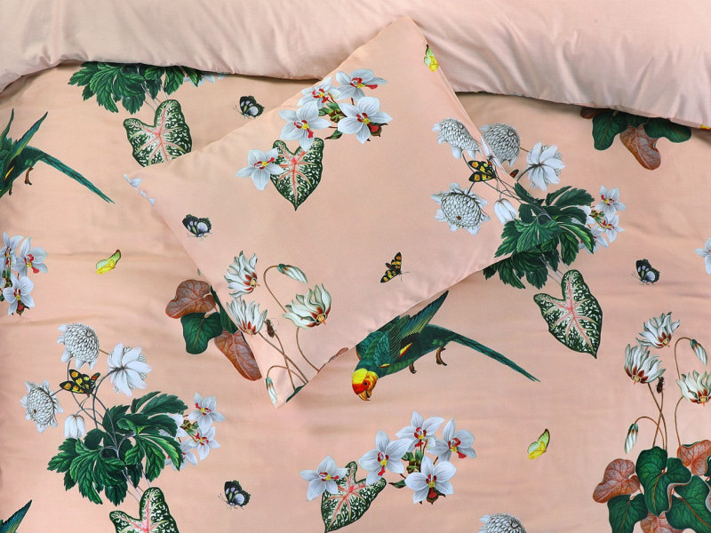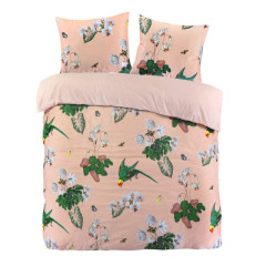 Creëer een betoverende en exotische sfeer in je slaapkamer. De zachtroze achtergrond is op de voorzijde bedrukt met bloemen, vlinders en papegaaien. De combinatie van kleuren en levendige motieven maken van dit overtrek een absolute eye-catcher.