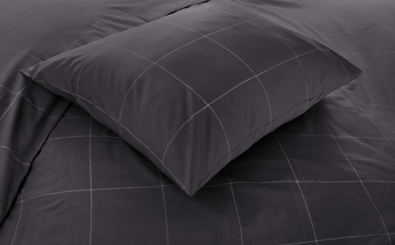 Close-up van een kussen op zwart geblokte lakens, met een gezellige en moderne uitstraling.