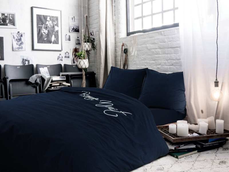 Donkerblauw bed met witte letters op het overtrek, die een moderne en stijlvolle uitstraling geven aan de slaapkamer.