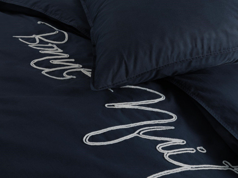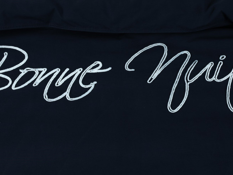 Close up van stijlvol dekbedovertrek met de tekst 'bonne nuit' in een opvallend lettertype.