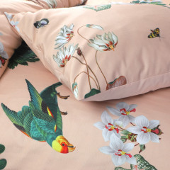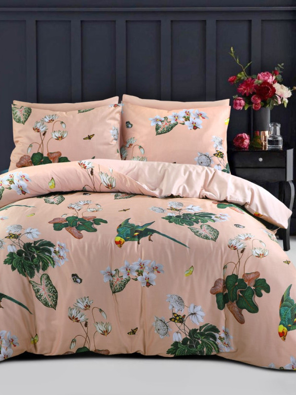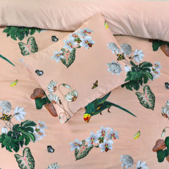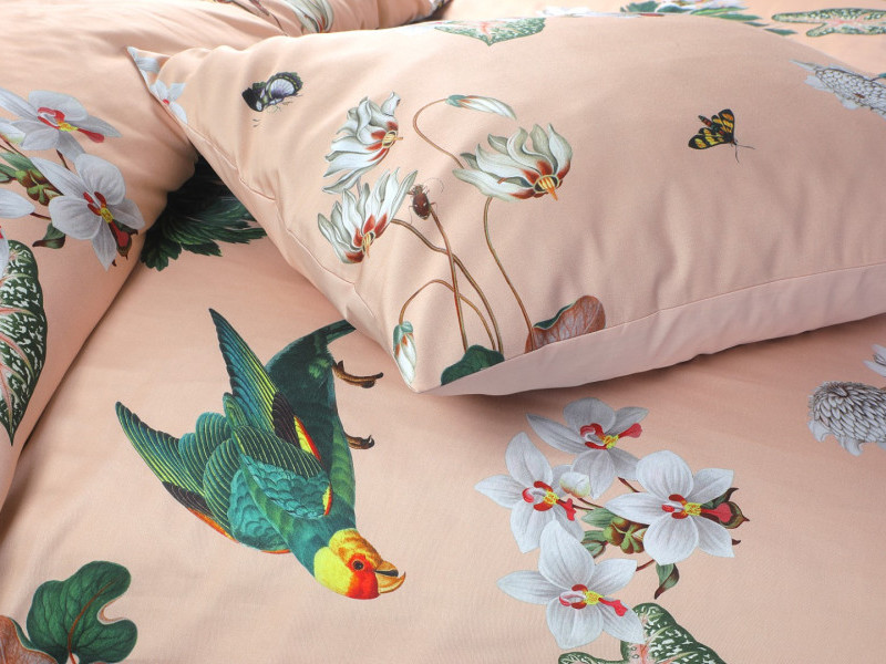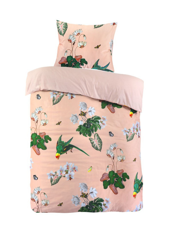 Creëer een betoverende en exotische sfeer in je slaapkamer. De zachtroze achtergrond is op de voorzijde bedrukt met bloemen, vlinders en papegaaien. De combinatie van kleuren en levendige motieven maken van dit overtrek een absolute eye-catcher.