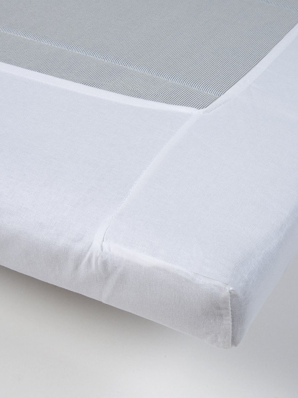 De onderkant van een matrastopper is te zien met een matrasbeschermer met speciale enveloppehoek.